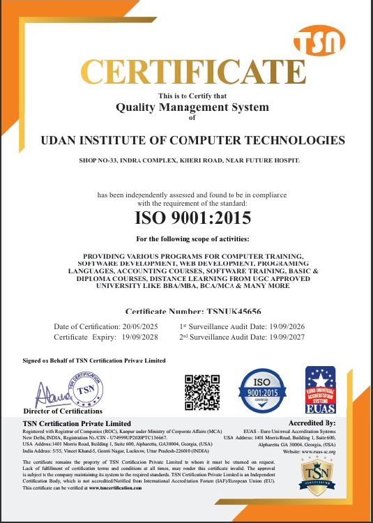 Udan Institute proudly holds the prestigious ISO 9001:2015 certification, a globally recognized standard for quality management systems. This achievement reflects the institute's unwavering commitment to delivering excellence in education, maintaining robust administrative processes, and continuously improving its services to meet the evolving needs of students and stakeholders. By adhering to the rigorous benchmarks set by ISO 9001:2015, Udan Institute ensures transparency, consistency, and a student-centric approach across all its operations—reinforcing its reputation as a trusted and quality-driven educational institution.