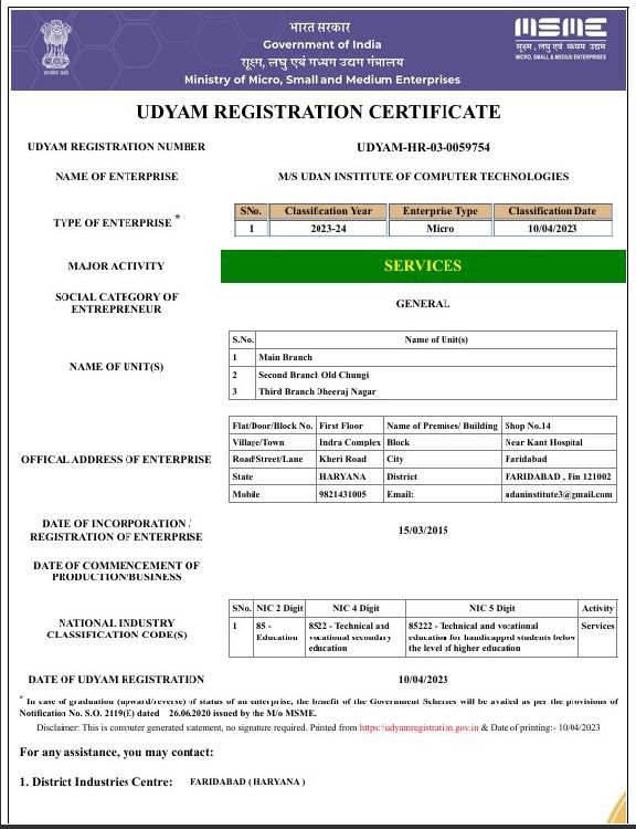 Udan Institute is proudly certified by the Ministry of Micro, Small & Medium Enterprises (MSME), Government of India—an endorsement that highlights its dedication to fostering skill development, entrepreneurship, and inclusive growth. This certification not only validates the institute’s commitment to quality education and vocational training but also enables it to access government-backed initiatives, funding opportunities, and industry collaborations. As an MSME-recognized institution, Udan Institute plays a vital role in empowering students with practical skills and career-ready programs that align with national development goals.